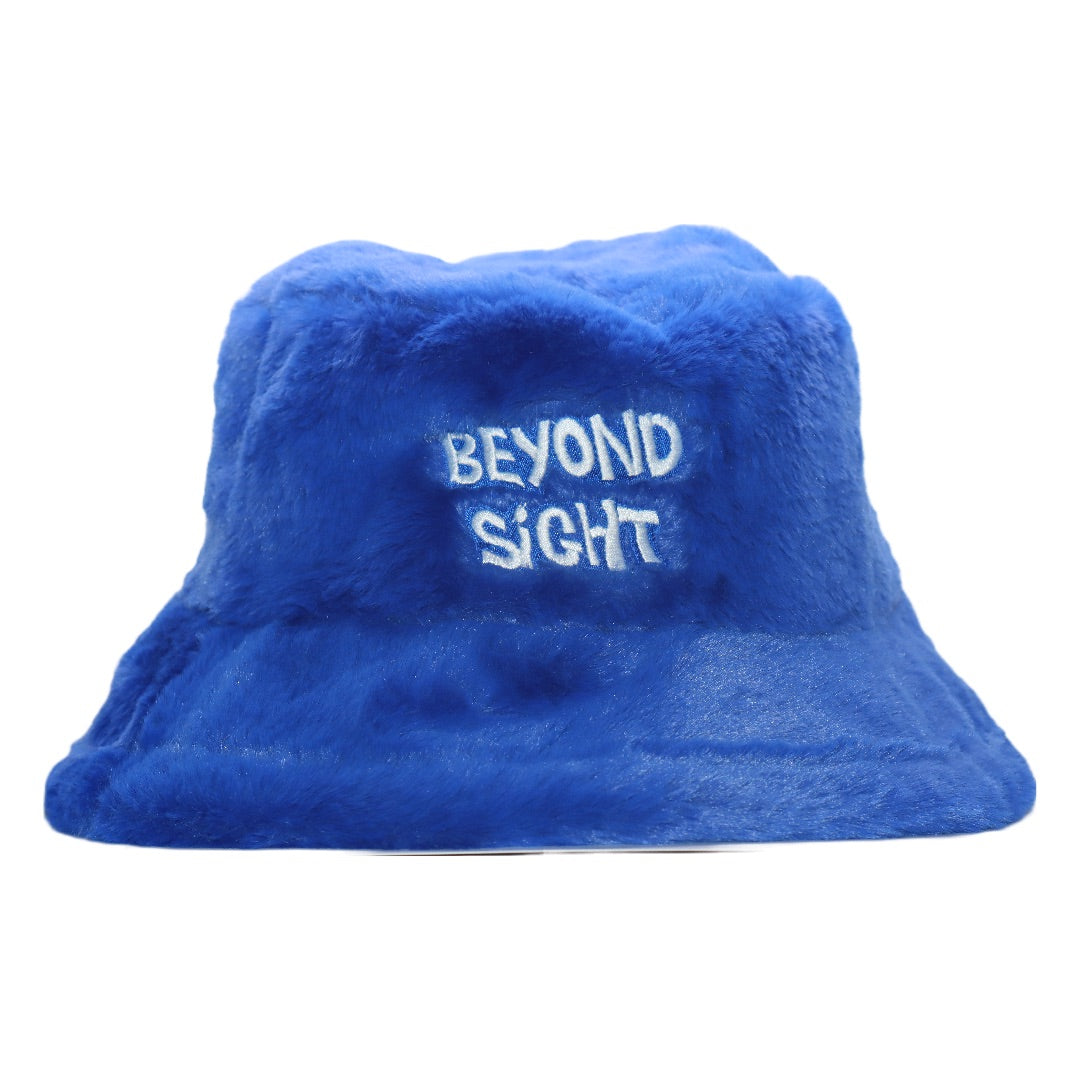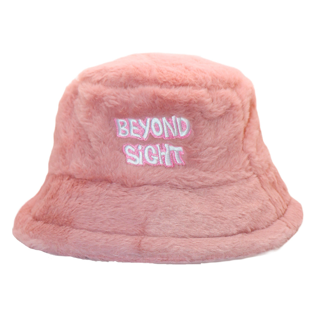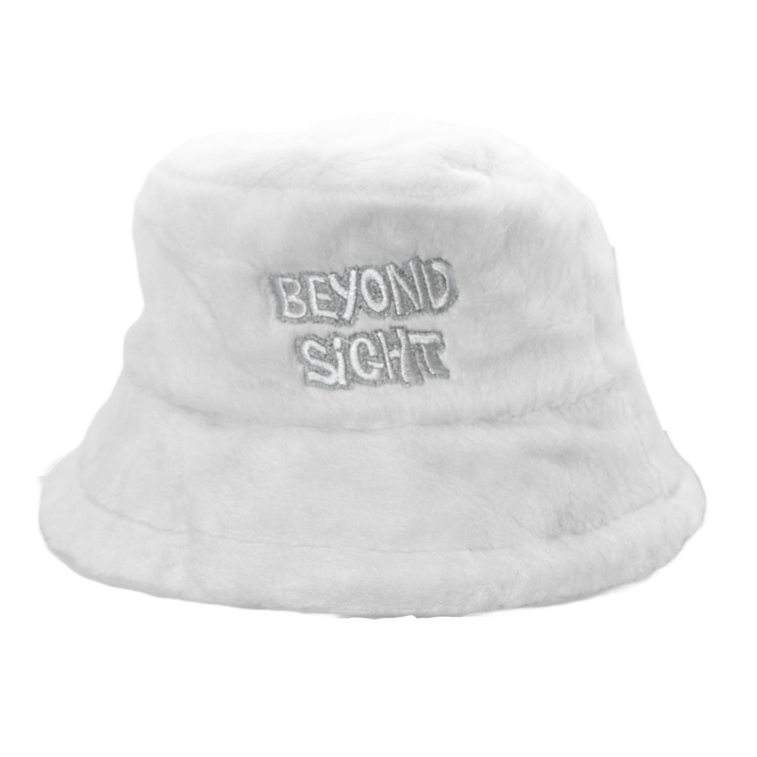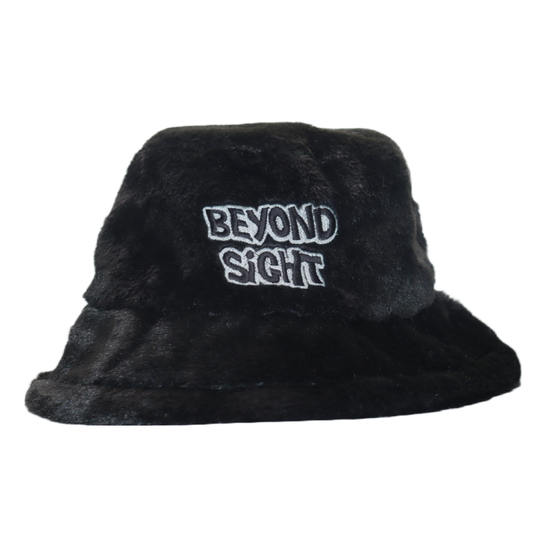 Fuzzy bucket hat with Beyond Sight logo embroidered on the front and center.
