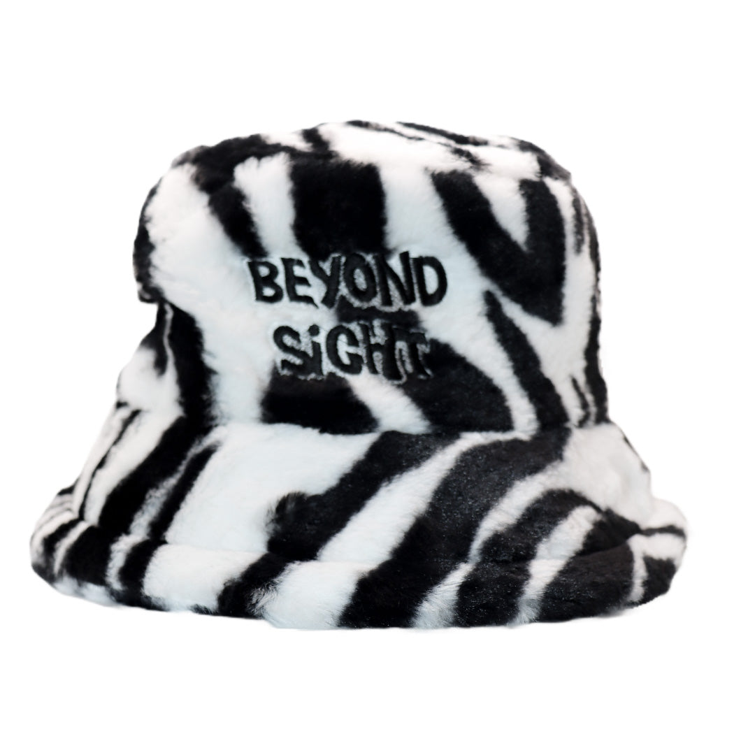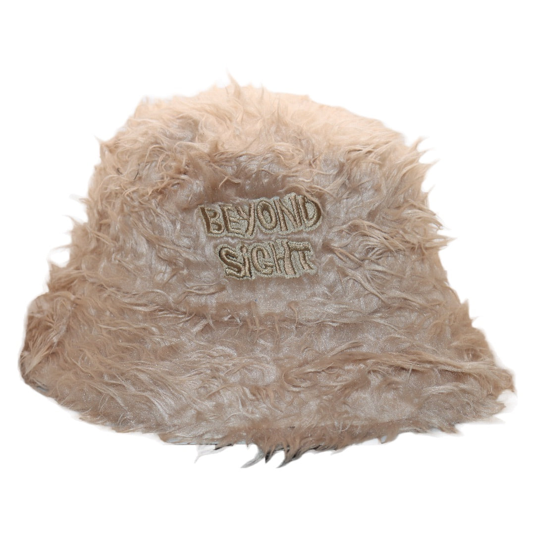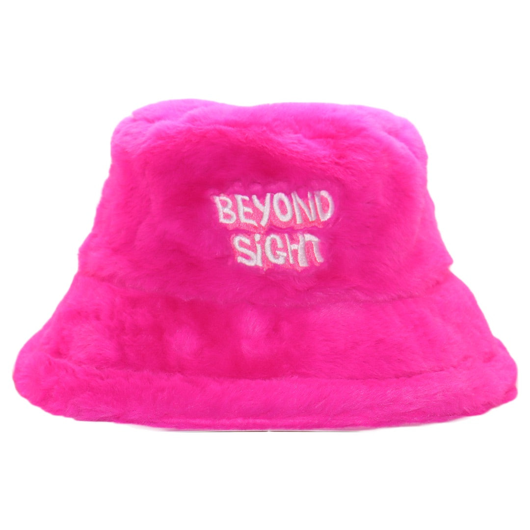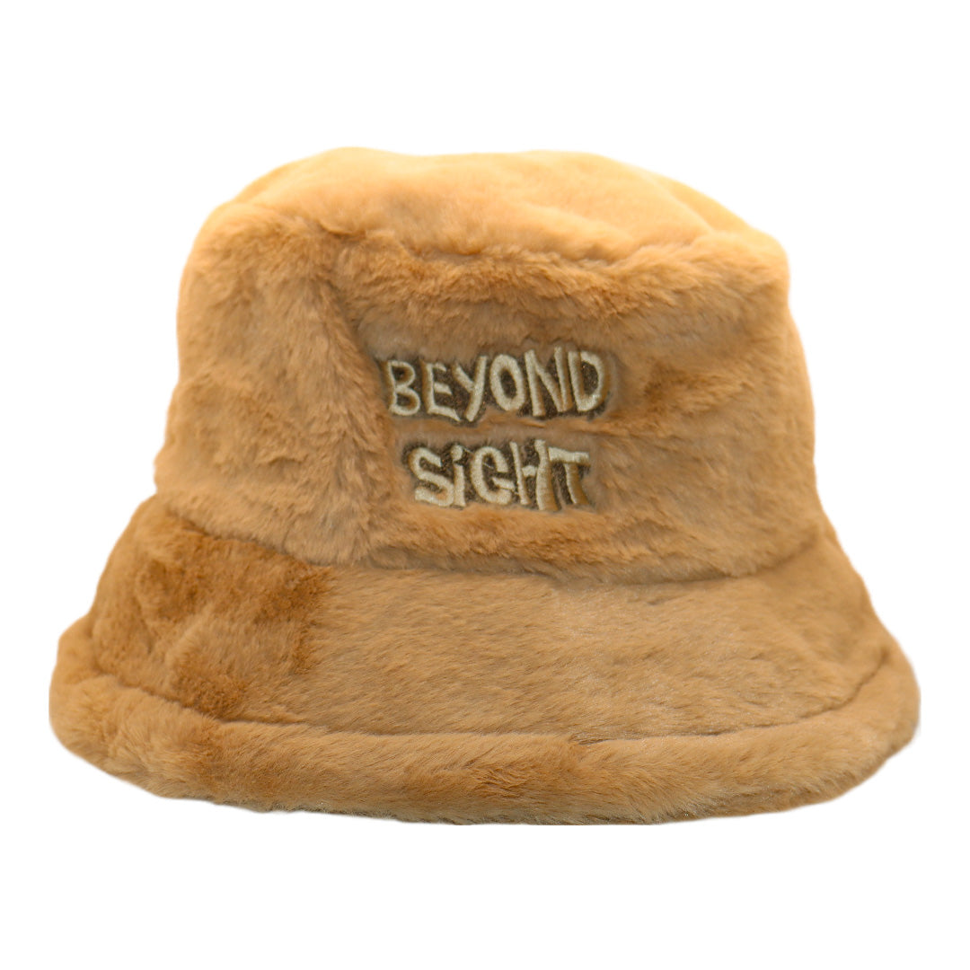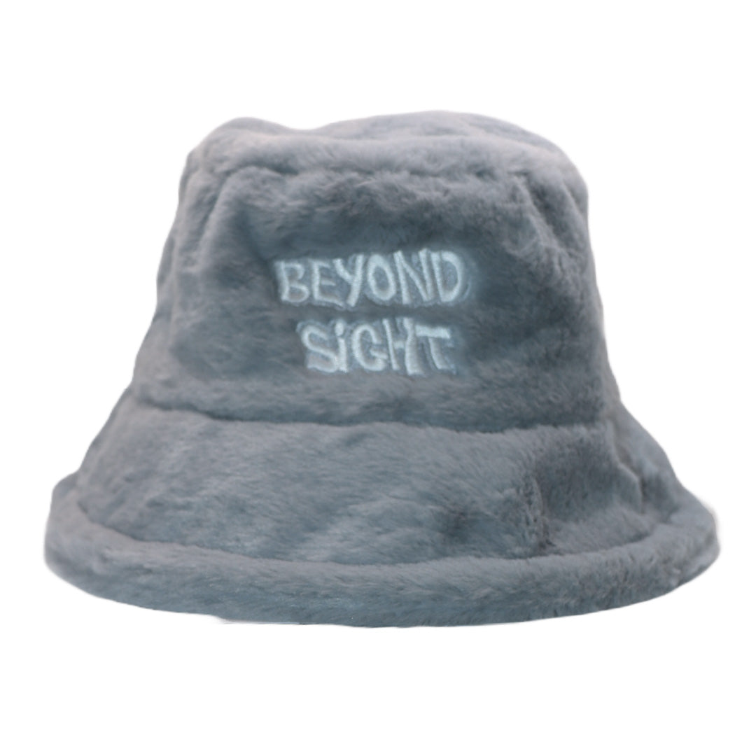 Fuzzy bucket hat with Beyond Sight logo embroidered on the front and center.