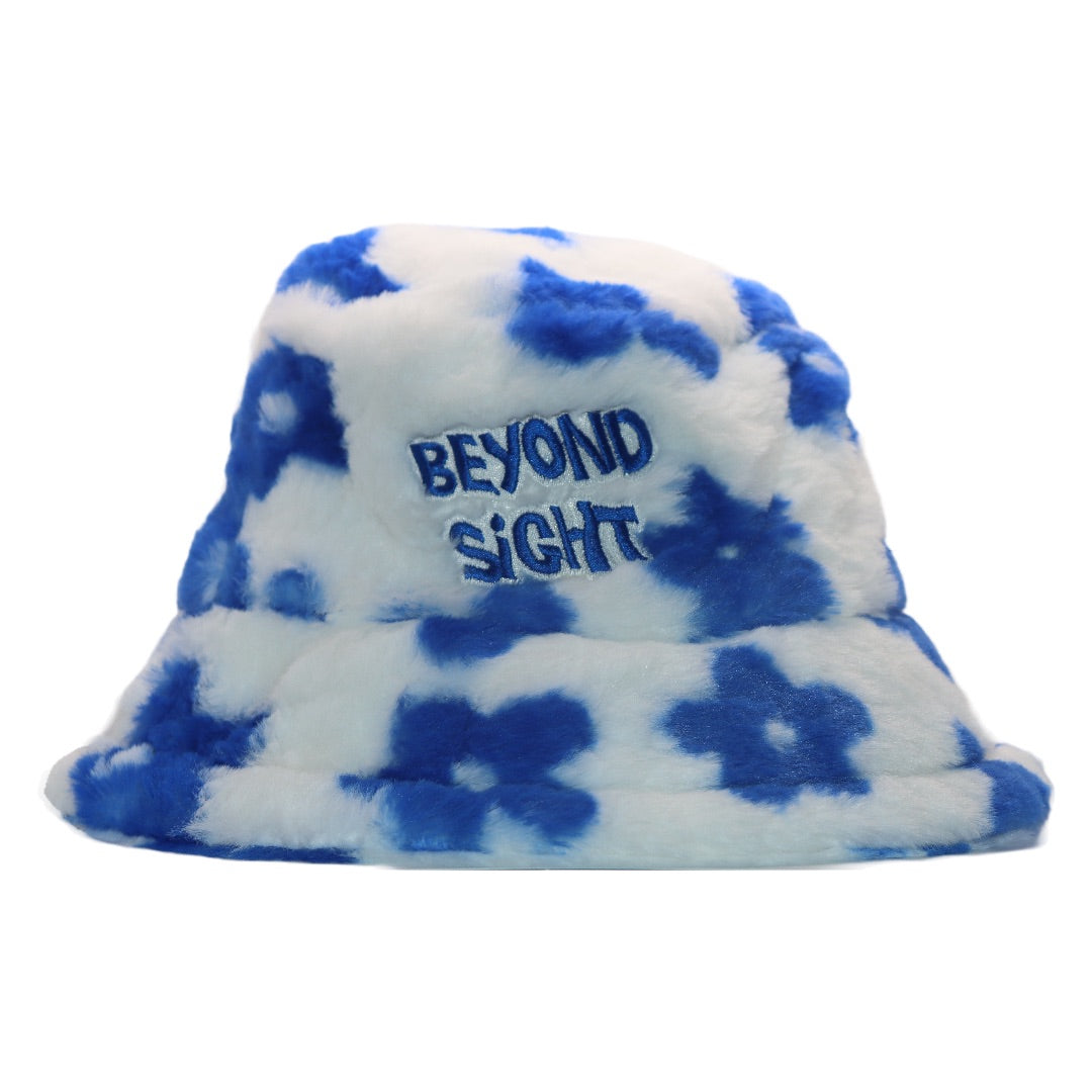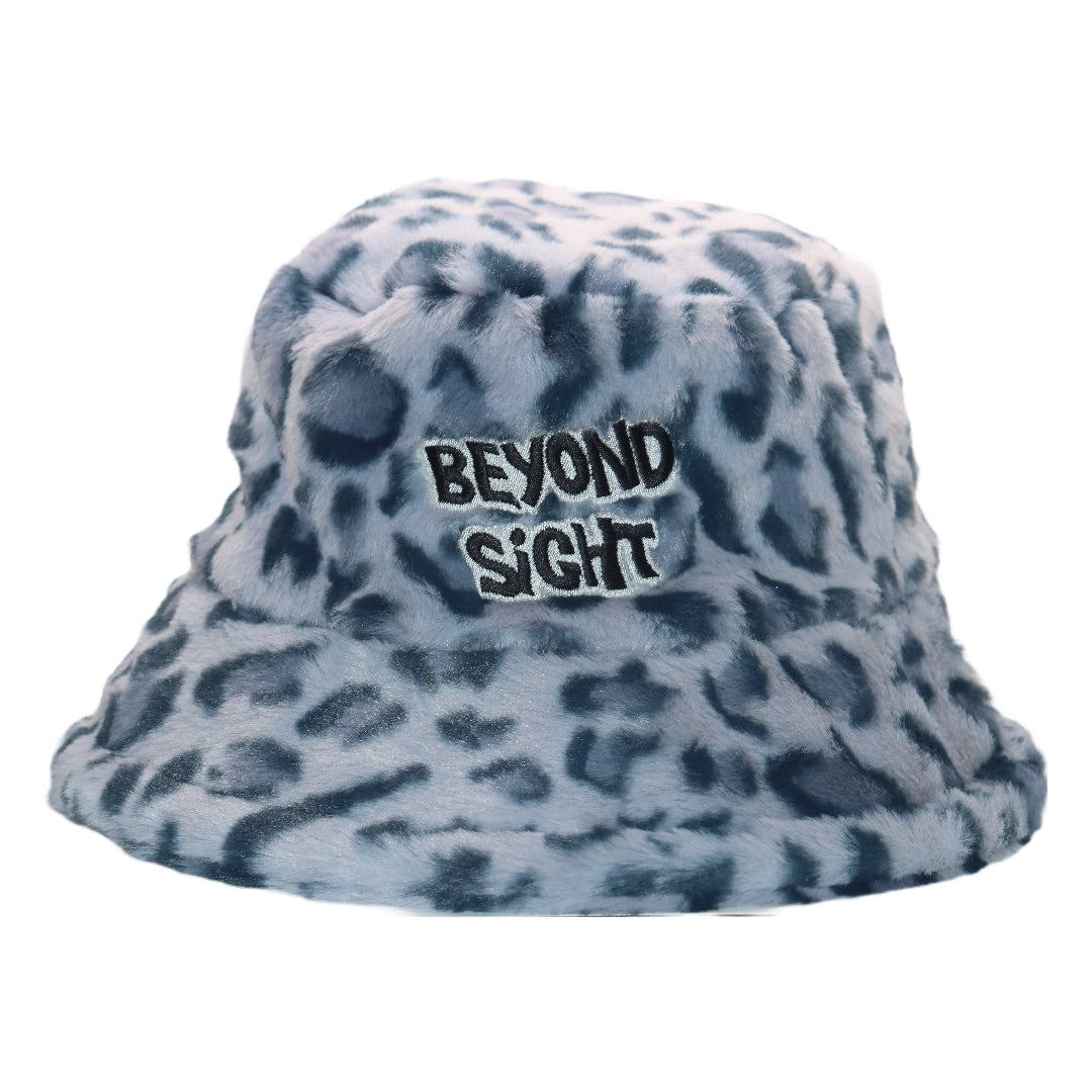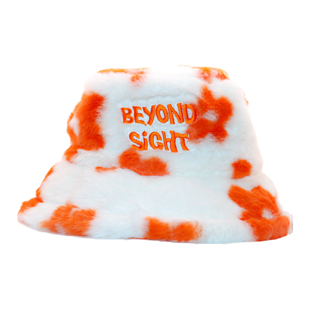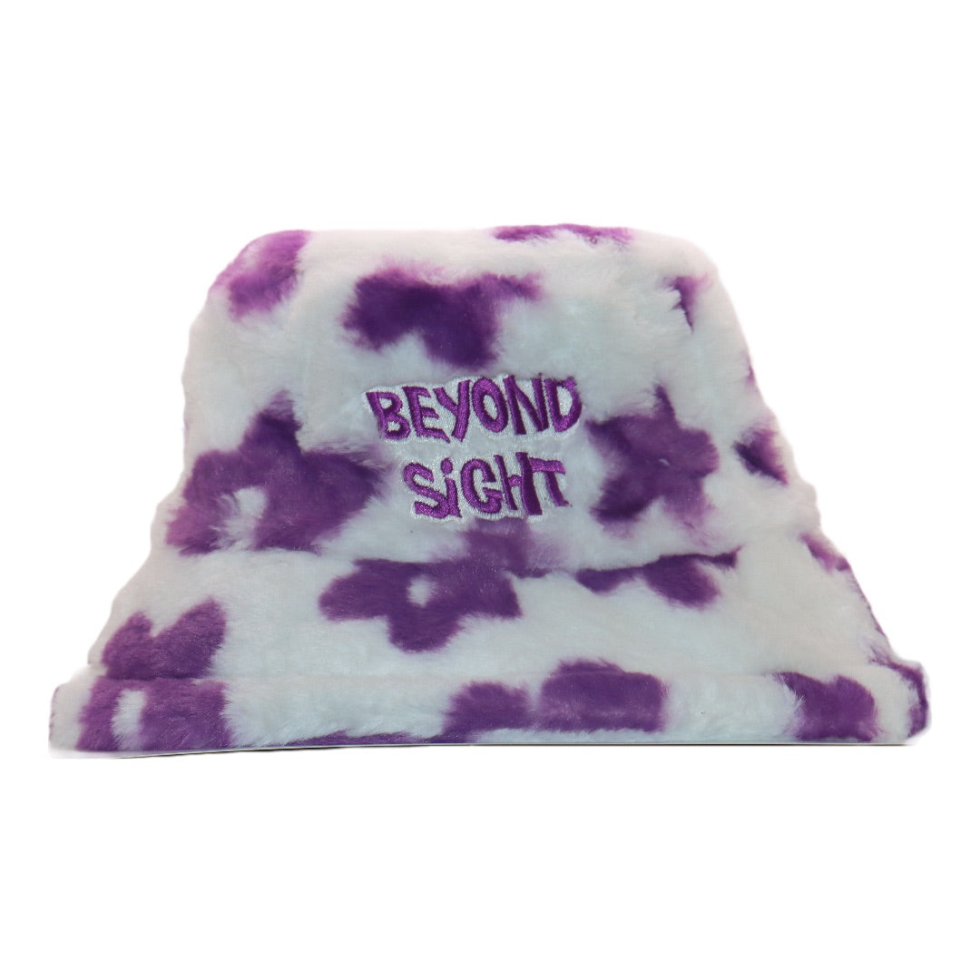 Fuzzy bucket hat with Beyond Sight logo embroidered on the front and center.