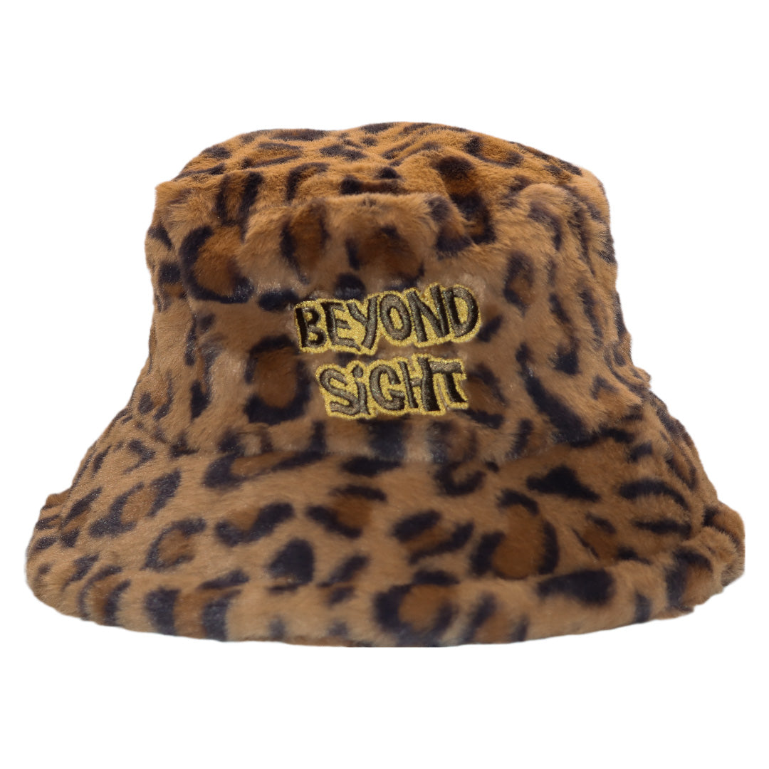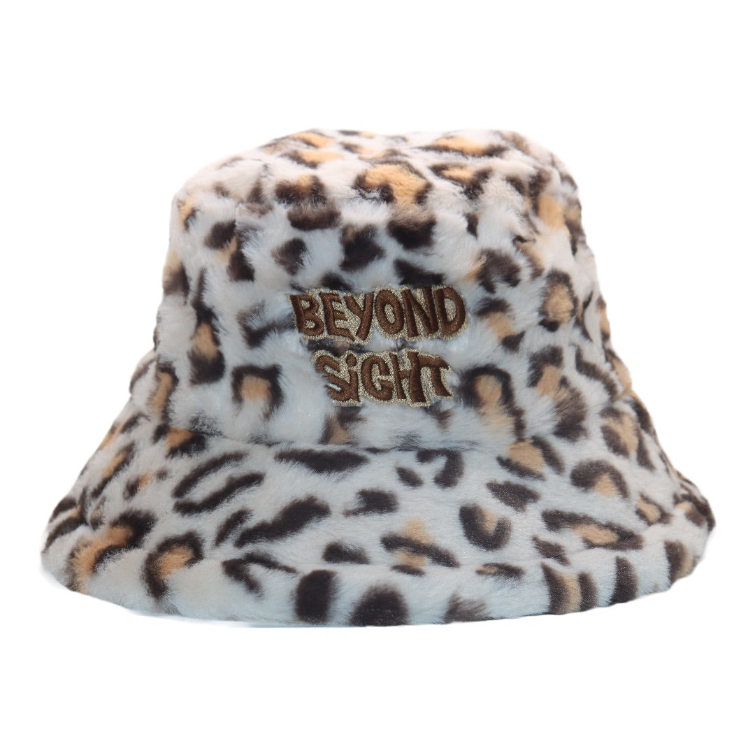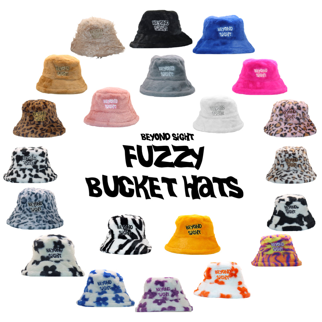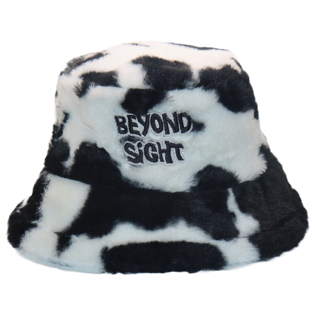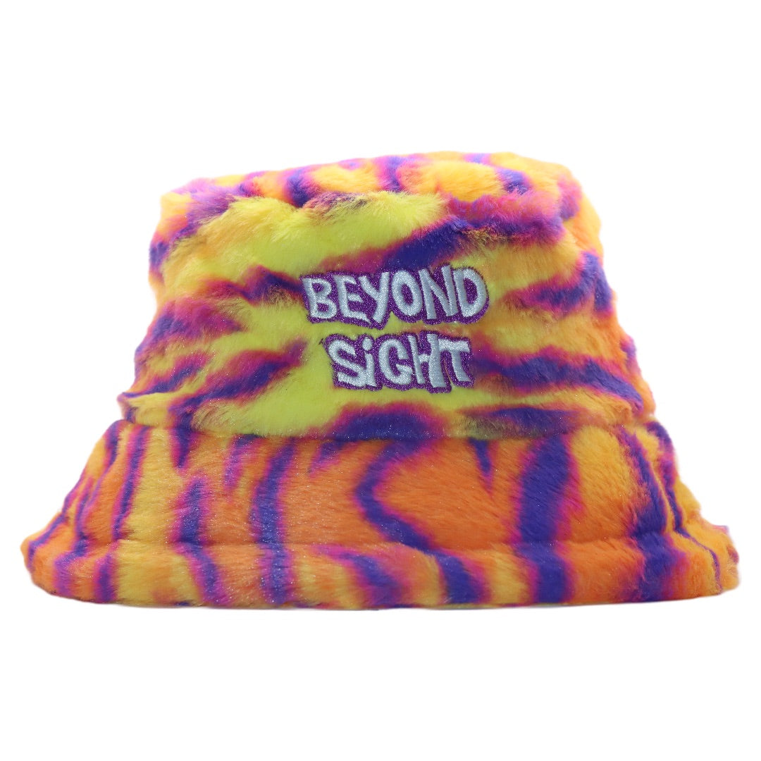 Fuzzy bucket hat with Beyond Sight logo embroidered on the front and center.
