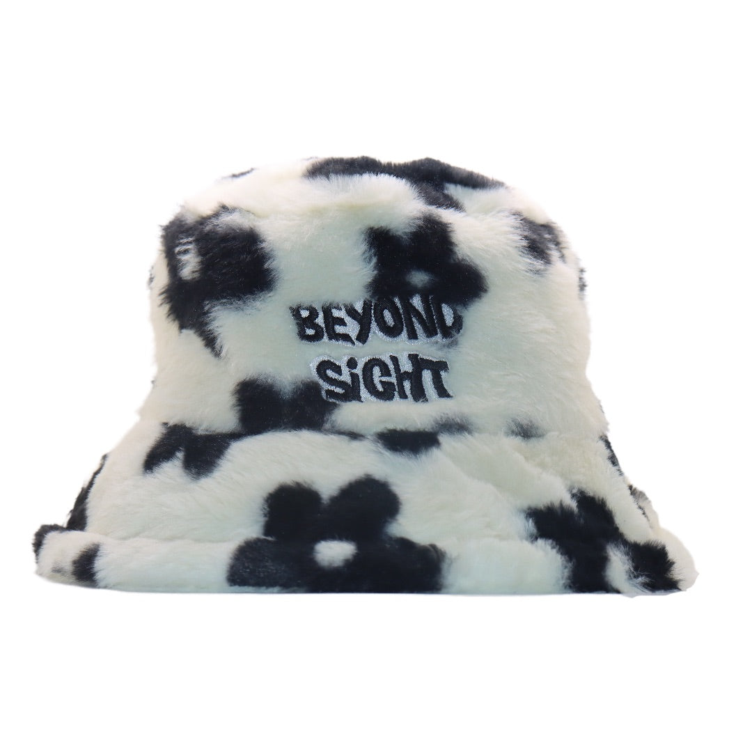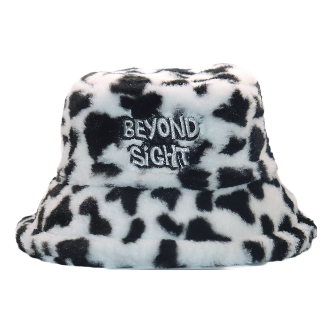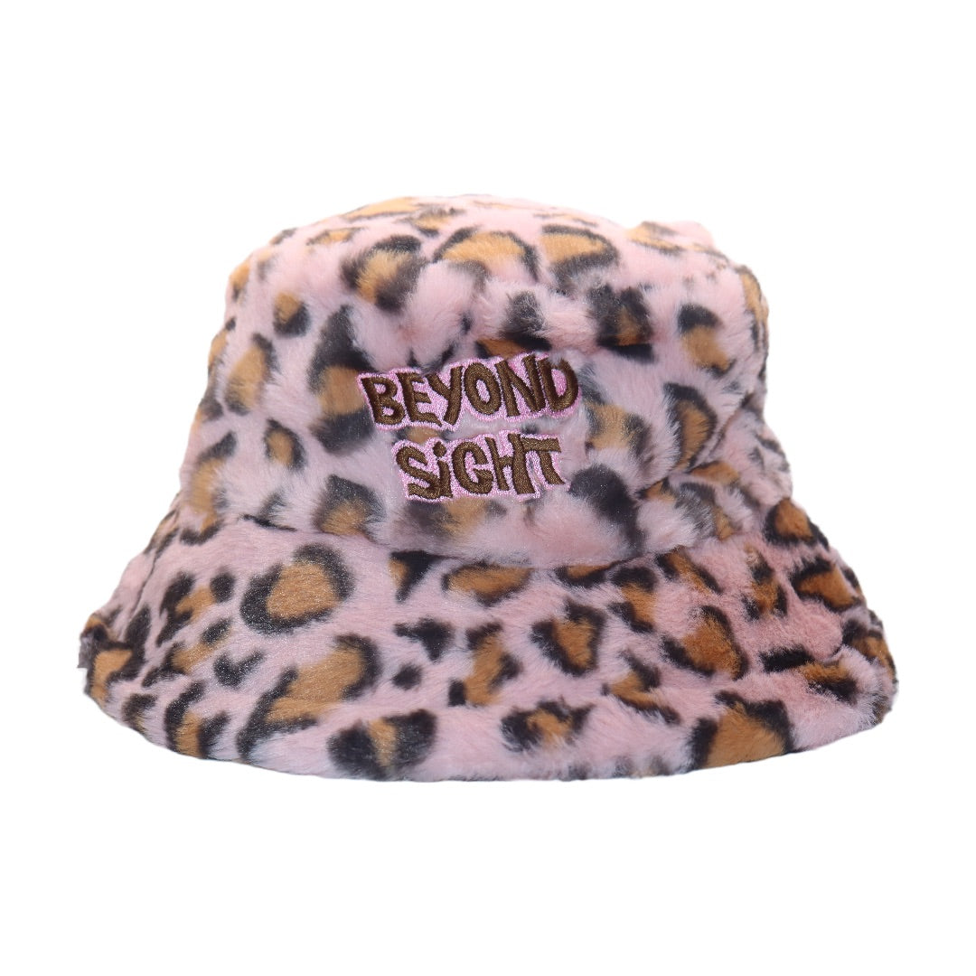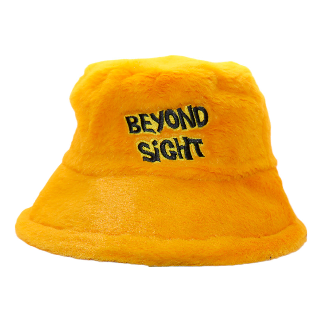 Fuzzy bucket hat with Beyond Sight logo embroidered on the front and center.